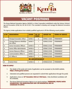 Are you a skilled professional looking for a rewarding career in Kenya’s public sector? The Kenya National Innovation Agency (KeNIA) has announced multiple exciting job vacancies for 2025. This is a unique opportunity to contribute to the national agenda by building a robust innovation ecosystem.