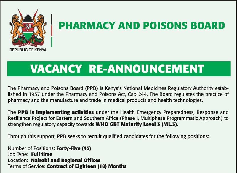 The Pharmacy and Poisons Board (PPB), Kenya’s National Medicines Regulatory Authority, has announced a new round of recruitment for 45 full-time positions.