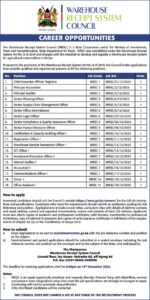 The Warehouse Receipt System Council (WRSC) is inviting qualified and experienced Kenyan professionals to apply for various employment opportunities. As a State Corporation established under the Warehouse Receipt System Act, the WRSC is responsible for developing and regulating a modern warehouse receipt system for agricultural commodities in Kenya.